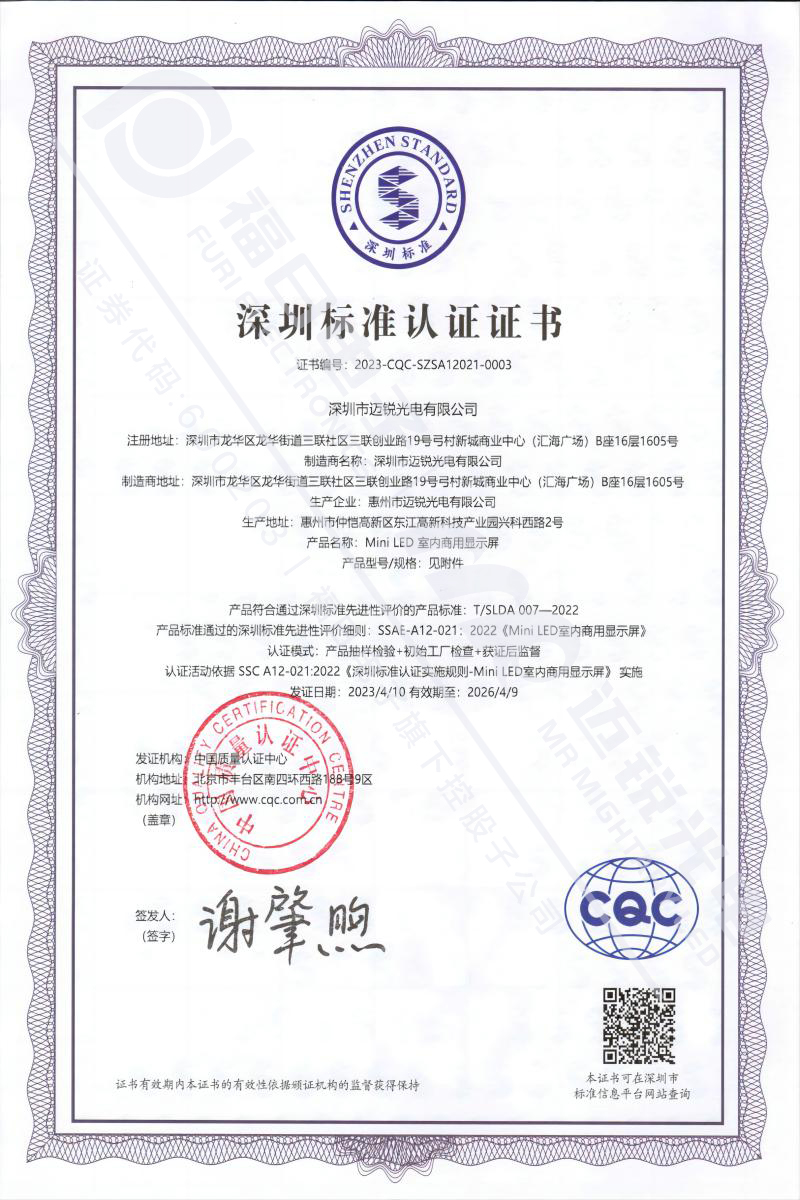近日,mile米乐光电荣获智能显示终端产品目录“深圳标准认证”证书——Mini LED室内商用显示屏类目首张认证证书。